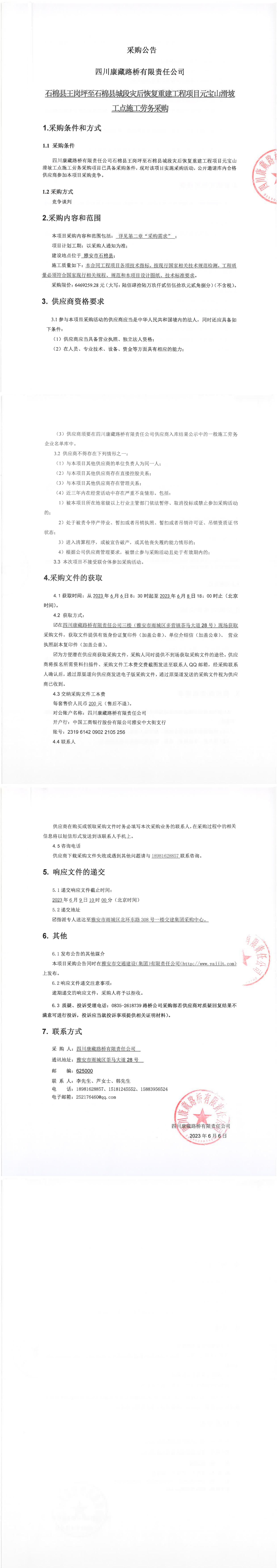 四川康藏路橋有限責(zé)任公司石棉縣王崗坪至石棉縣城段災(zāi)后恢復(fù)重建工程項目元寶山滑坡工點施工勞務(wù)采購