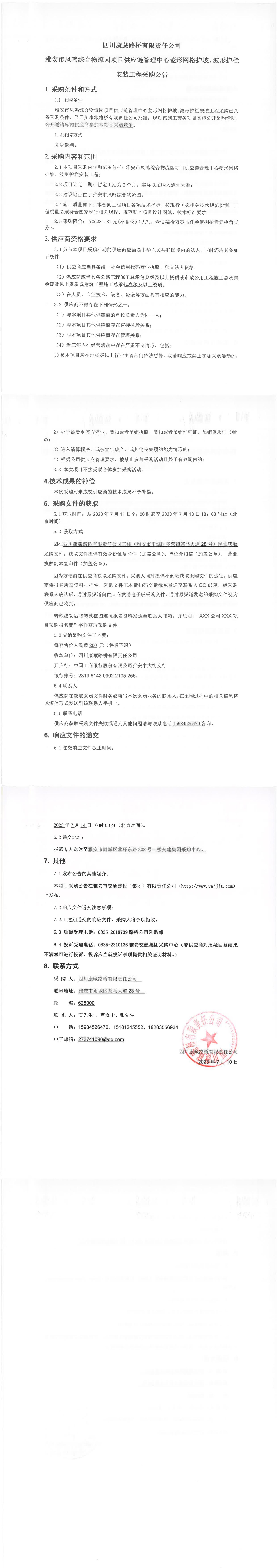 四川康藏路橋有限責(zé)任公司雅安市鳳鳴綜合物流園項目供應(yīng)鏈管理中心菱形網(wǎng)格護(hù)坡、波形護(hù)欄安裝工程采購公告