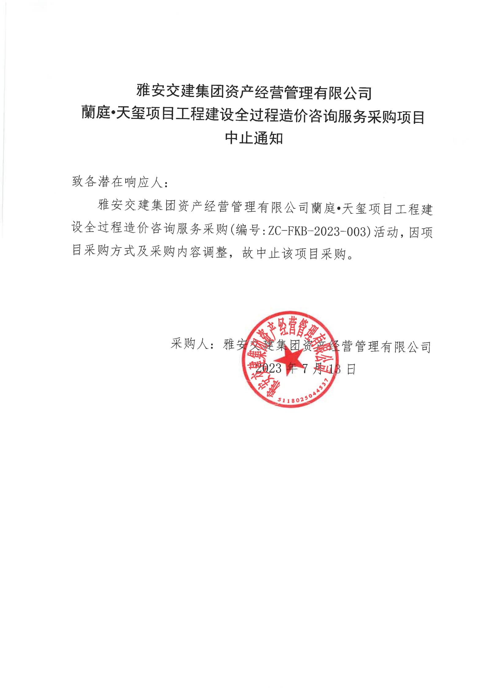 雅安交建集團(tuán)資產(chǎn)經(jīng)營管理有限公司蘭庭·天璽項目工程建設(shè)全過程造價咨詢服務(wù)采購項目中止通知