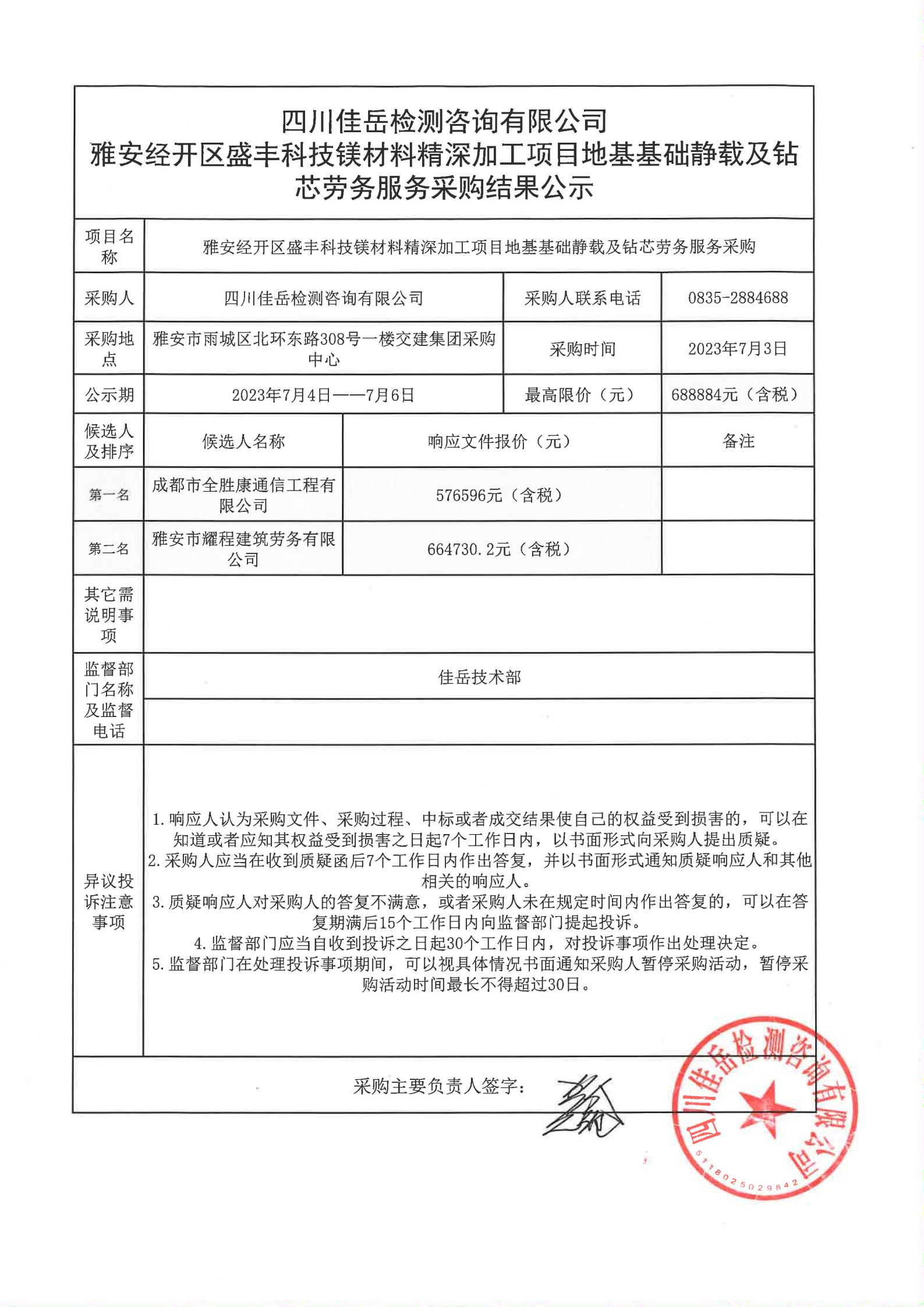 四川佳岳檢測咨詢有限公司雅安經(jīng)開區(qū)盛豐科技鎂材料精深加工項(xiàng)目地基基礎(chǔ)靜載及鉆芯服務(wù)采購結(jié)果公示