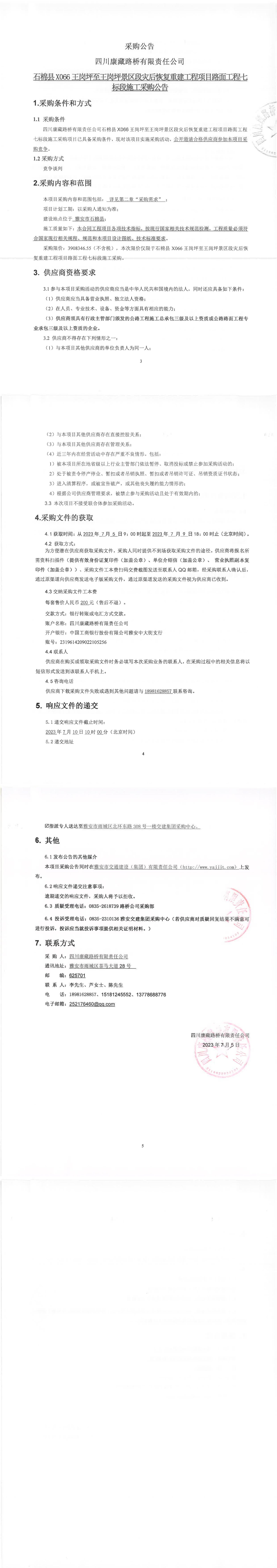 四川康藏路橋有限責(zé)任公司石棉縣X66X王崗坪景區(qū)段災(zāi)后恢復(fù)重建工程項目路面工程七標(biāo)段施工采購公告