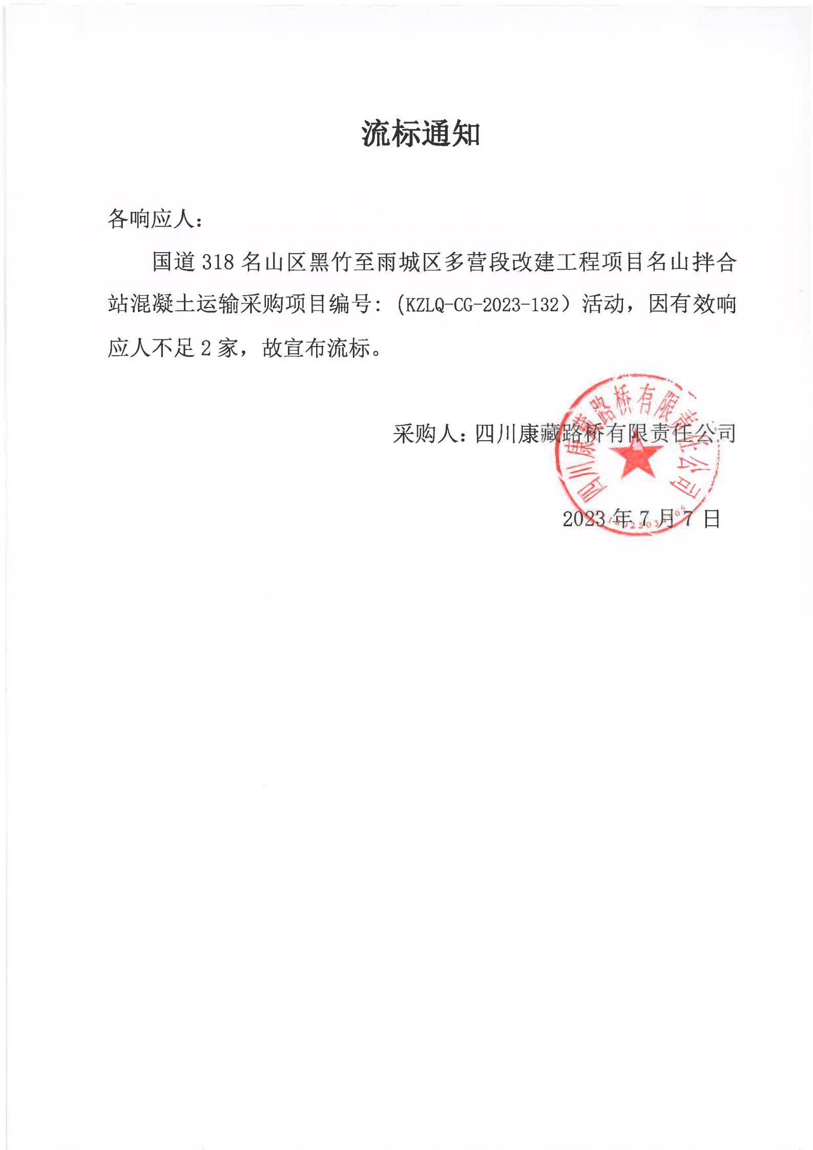 四川康藏路橋有限責(zé)任公司國道318名山區(qū)黑竹(成都界)至雨城區(qū)多營段改建工程項目名山拌合站混凝土運輸采購流標(biāo)通知