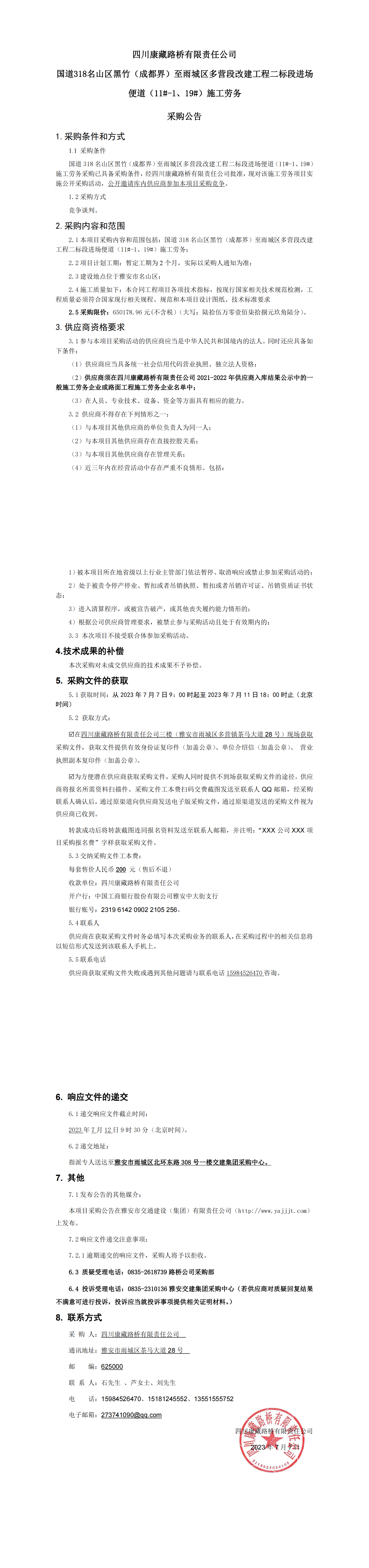 四川康藏路橋有限責任公司國道318名山區(qū)黑竹(成都界)至雨城區(qū)多營段改建工程二標段進場便道(11#-1、19#)施工勞務(wù)采購公告