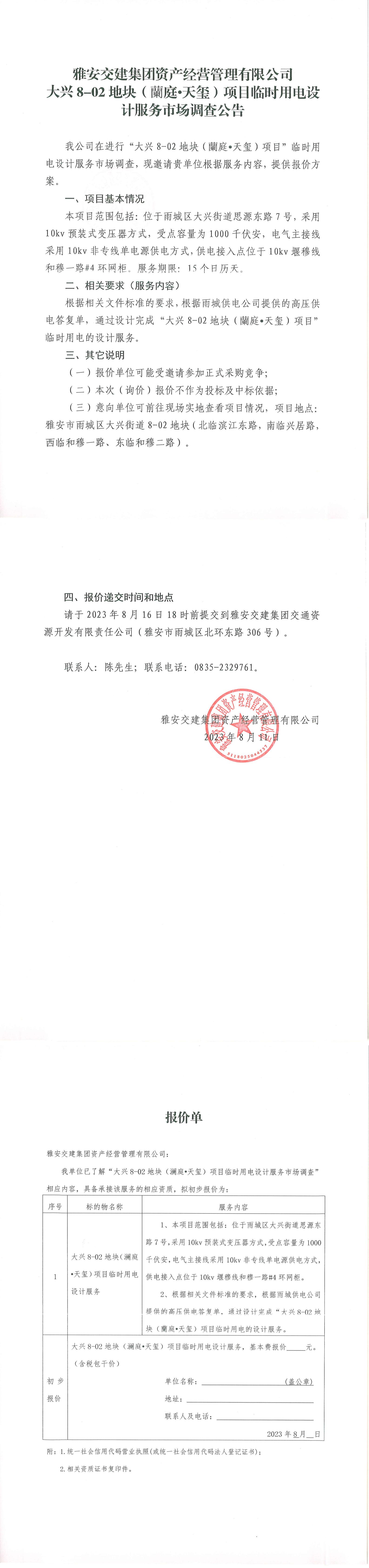 雅安交建集團資產經營管理有限公司大興8-02地塊(蘭庭·天璽)項目臨時用電設計服務市場調查公告