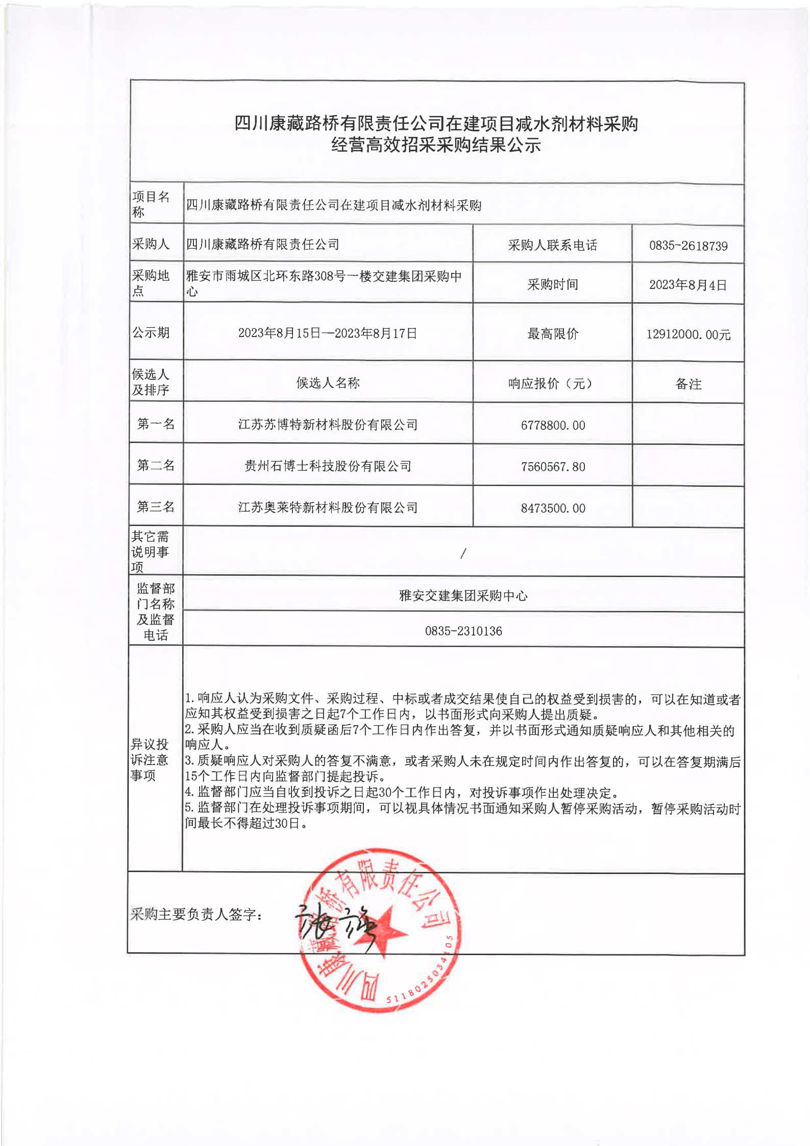 四川康藏路橋有限責(zé)任公司在建項(xiàng)目減水劑材料采購(gòu)經(jīng)營(yíng)高效招采采購(gòu)結(jié)果公示