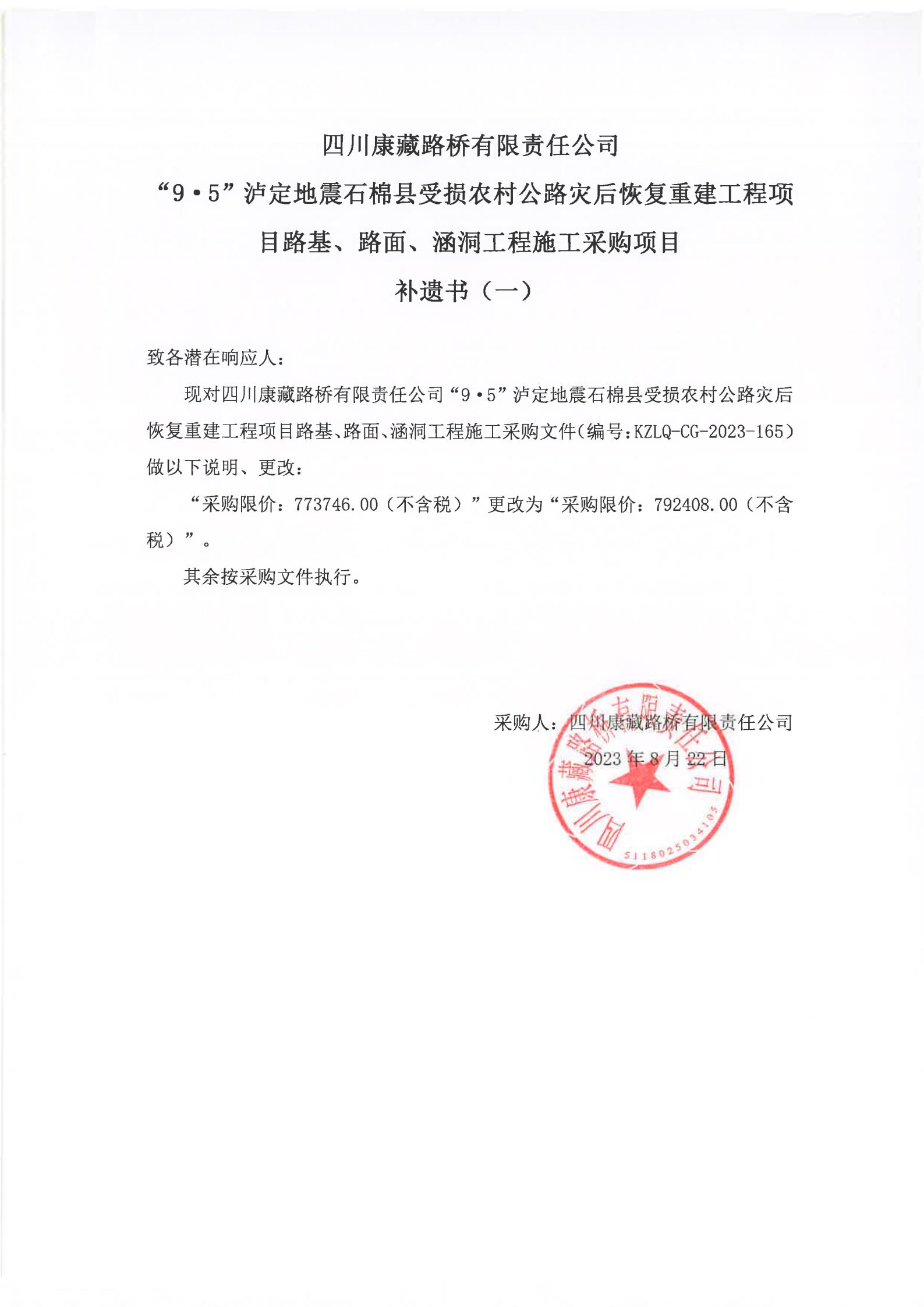 四川康藏路橋有限責(zé)任公司“9·5”瀘定地震石棉縣受損農(nóng)村公路災(zāi)后恢復(fù)重建工程項(xiàng)目路基、路面、涵洞工程施工采購(gòu)項(xiàng)目補(bǔ)遺書(shū)(一)