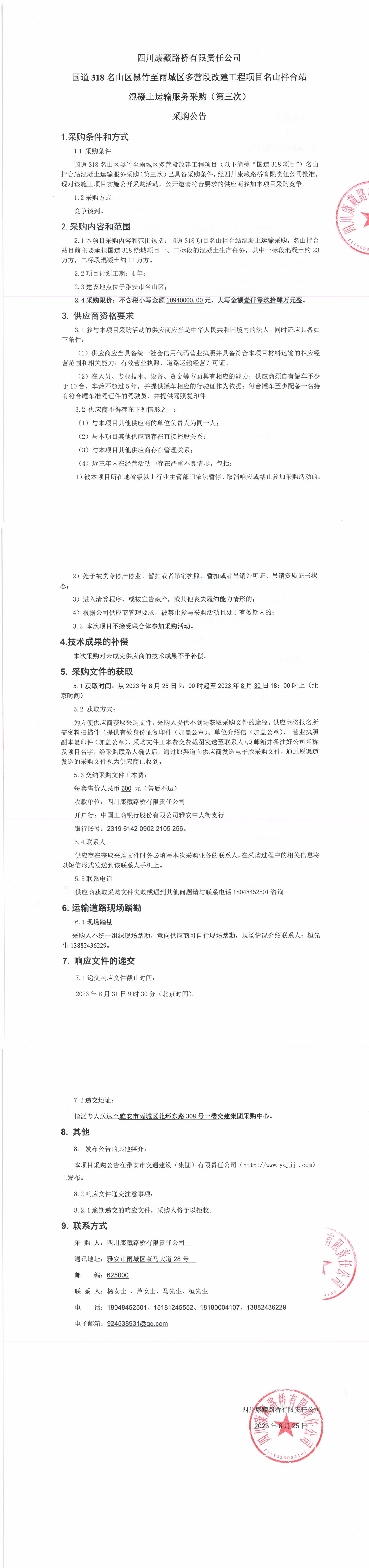 四川康藏路橋有限責(zé)任公司國(guó)道318名山區(qū)黑竹至雨城區(qū)多營(yíng)段改建工程項(xiàng)目名山拌合站混凝土運(yùn)輸服務(wù)采購(gòu)(第三次)采購(gòu)公告