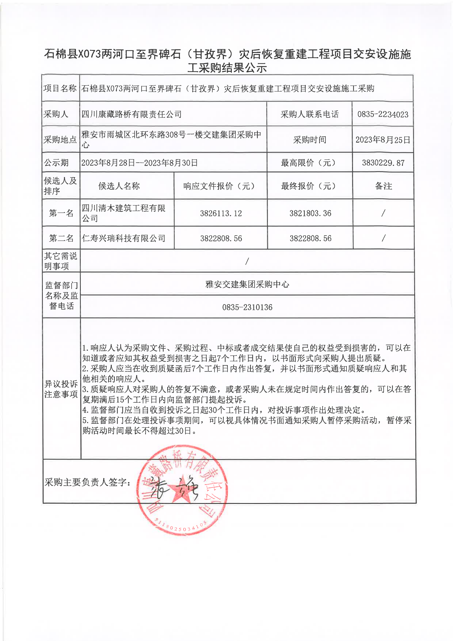四川康藏路橋有限責(zé)任公司石棉縣X073兩河口至界碑石(甘孜界)災(zāi)后恢復(fù)重建工程項(xiàng)目交安設(shè)施施工采購(gòu)結(jié)果公示