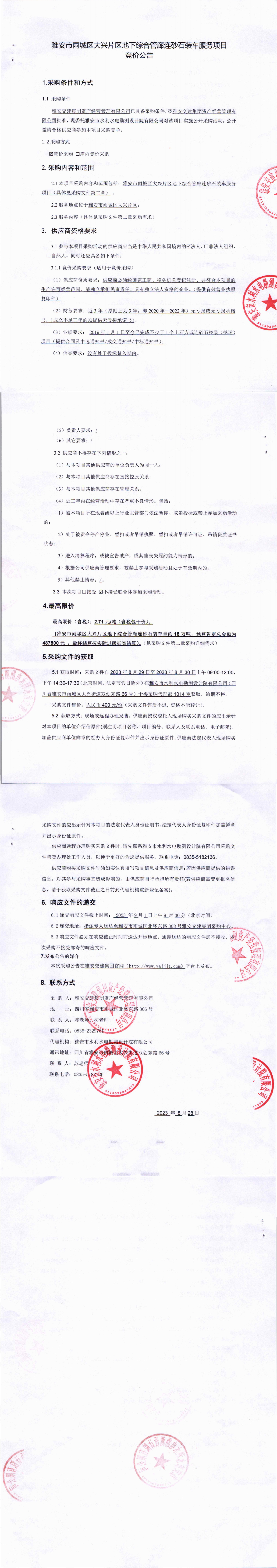 雅安交建集團資產(chǎn)經(jīng)營管理有限公司雅安市雨城區(qū)大興片區(qū)地下綜合管廊連砂石裝車服務項目競價公告