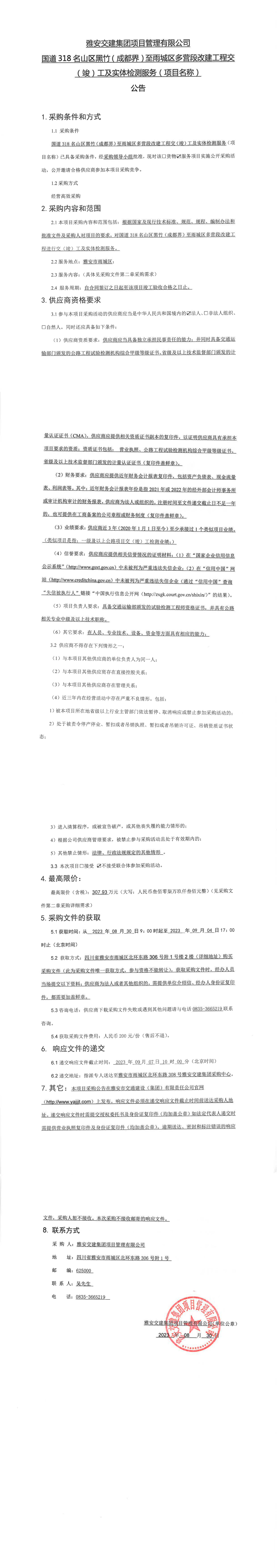 雅安交建集團(tuán)項目管理有限公司國道318名山區(qū)黑竹(成都界)至雨城區(qū)多營段改建工程交(竣)工及實體檢測服務(wù)(項目名稱)采購公告
