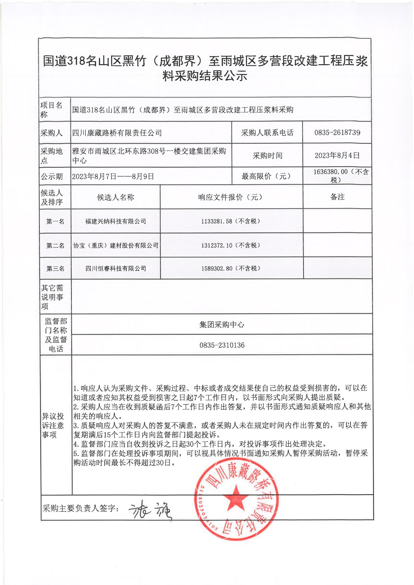 四川康藏路橋有限責任公司國道318名山區(qū)黑竹(成都界)至雨城區(qū)多營段改建工程壓漿料采購結(jié)果公示