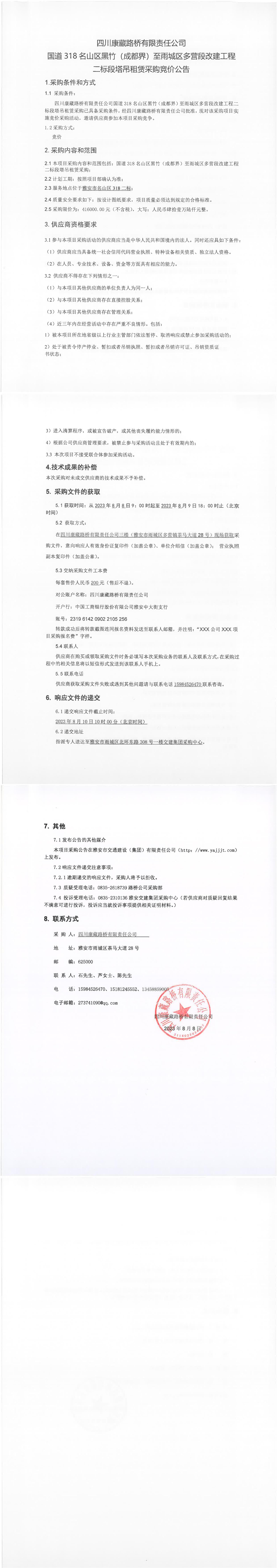 四川康藏路橋有限責(zé)任公司國(guó)道318名山區(qū)黑竹(成都界)至雨城區(qū)多營(yíng)段改建工程二標(biāo)段塔吊租賃采購(gòu)競(jìng)價(jià)公告