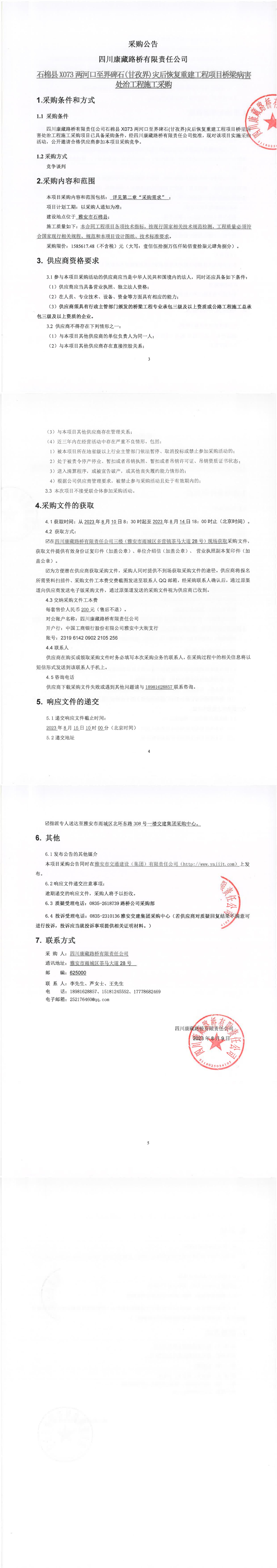 四川康藏路橋有限責(zé)任公司石棉縣X073兩河口至界碑石(甘孜界)災(zāi)后恢復(fù)重建工程項(xiàng)目橋梁病害處治工程施工采購