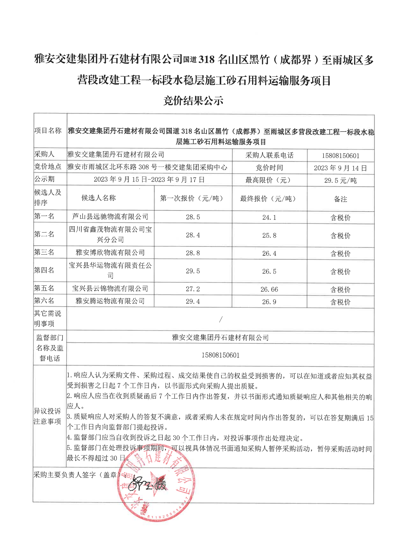 雅安交建集團丹石建材有限公司國道318名山區(qū)黑竹(成都界)至雨城區(qū)多營段改建工程一標段水穩(wěn)層施工砂石用料運輸服務項目競價結果公示