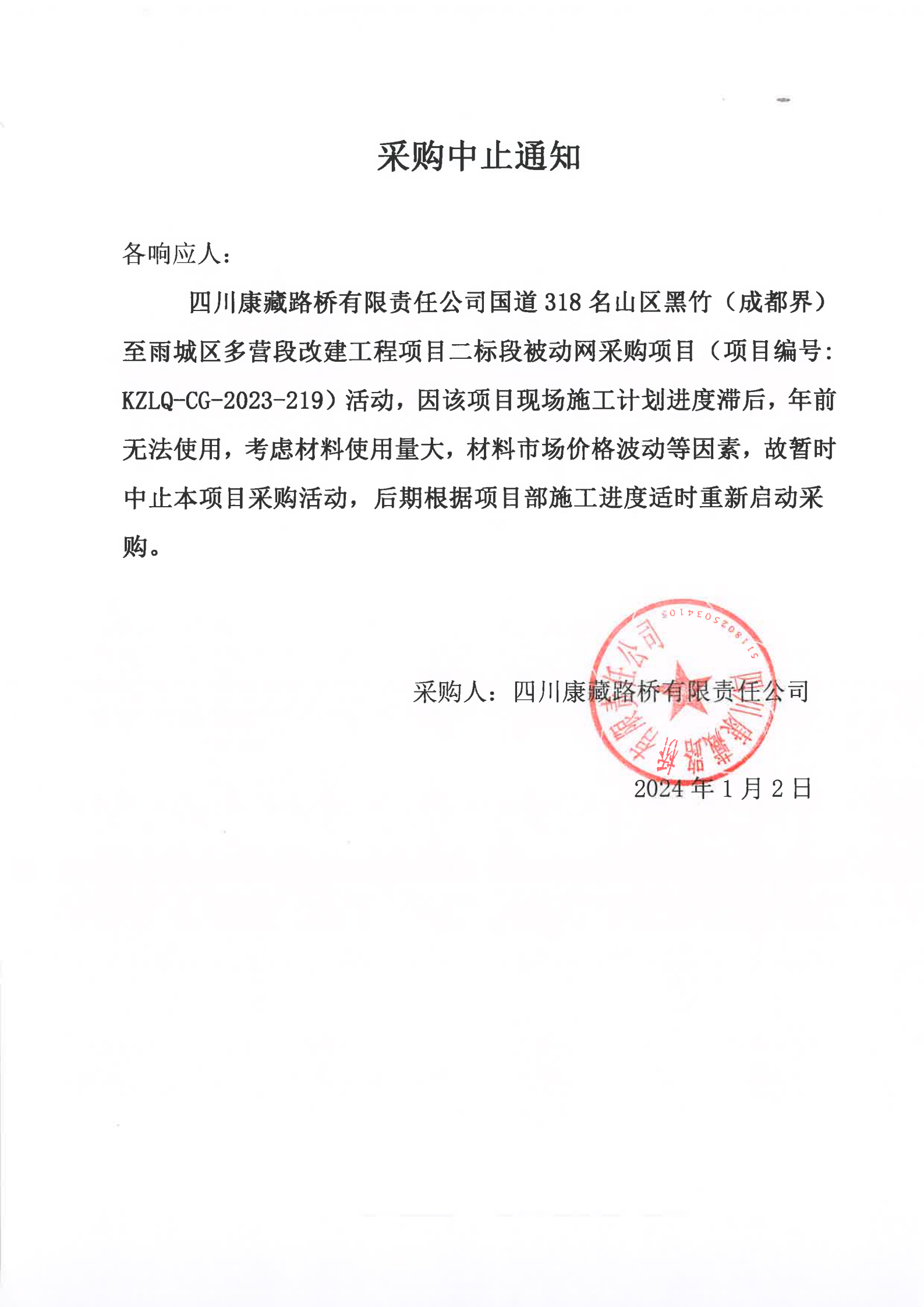 四川康藏路橋有限責(zé)任公司國道318名山區(qū)黑竹(成都界)至雨城區(qū)多營段改建工程項(xiàng)目二標(biāo)段被動(dòng)網(wǎng)采購項(xiàng)目采購中止通知