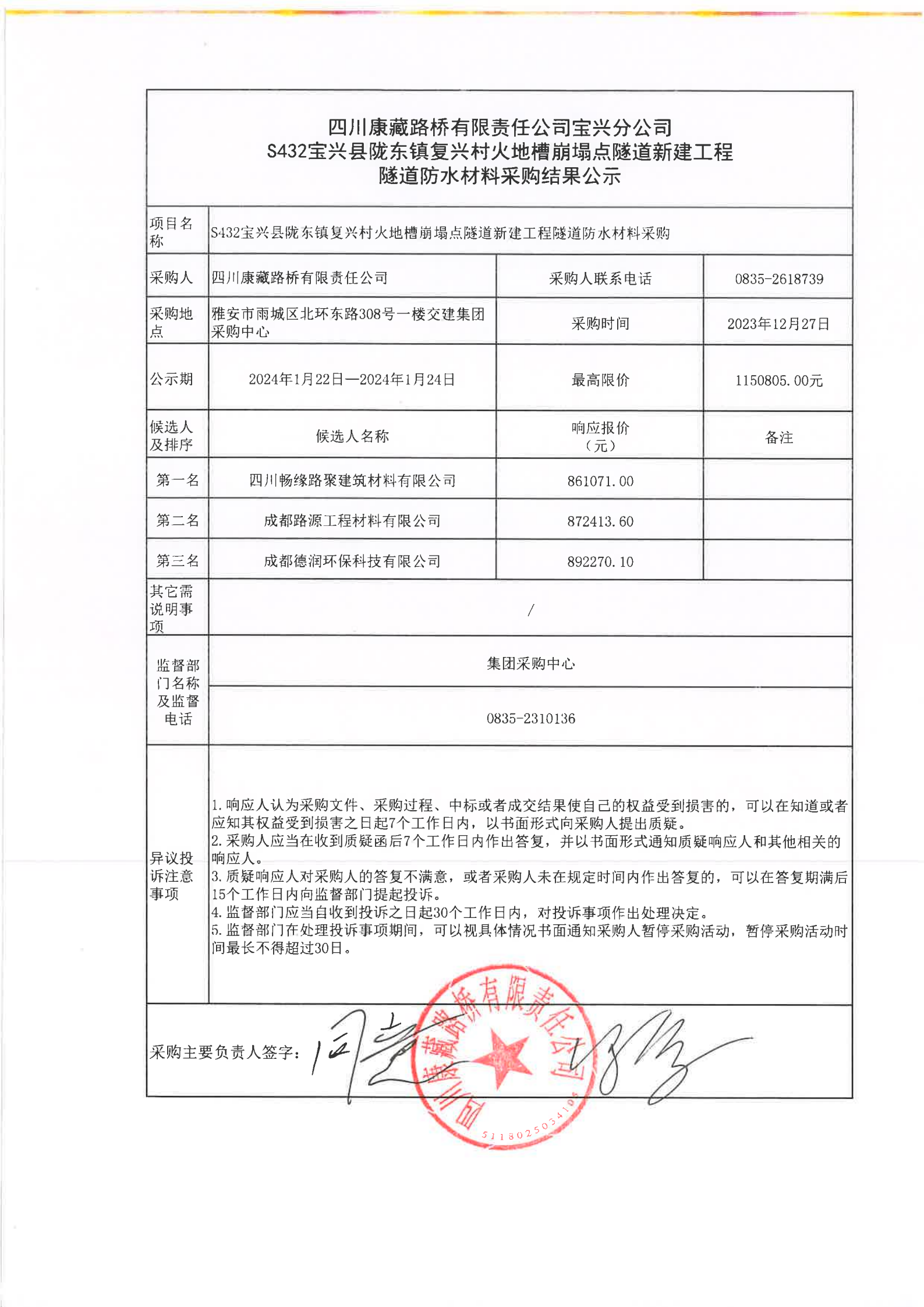 四川康藏路橋有限責任公司寶興分公司S432寶興縣隴東鎮(zhèn)復(fù)興村火地槽崩塌點隧道新建工程隧道防水材料采購結(jié)果公示
