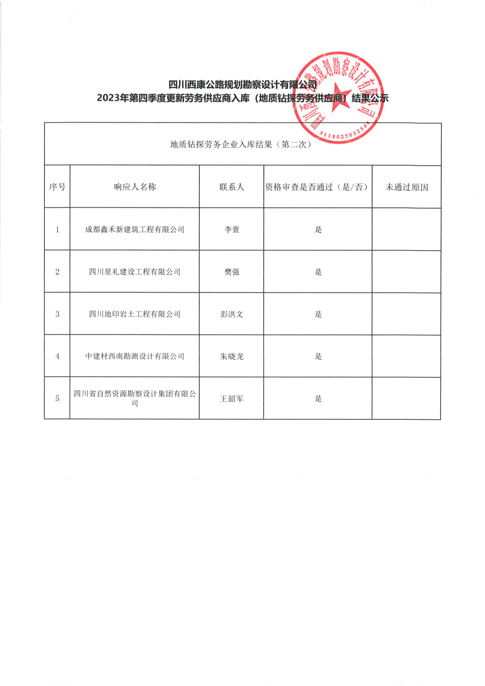 四川西康公路規(guī)劃勘察設(shè)計有限公司2023年第四季度更新勞務(wù)供應(yīng)入庫 (地質(zhì)鉆探勞務(wù)供應(yīng)商)結(jié)果公示