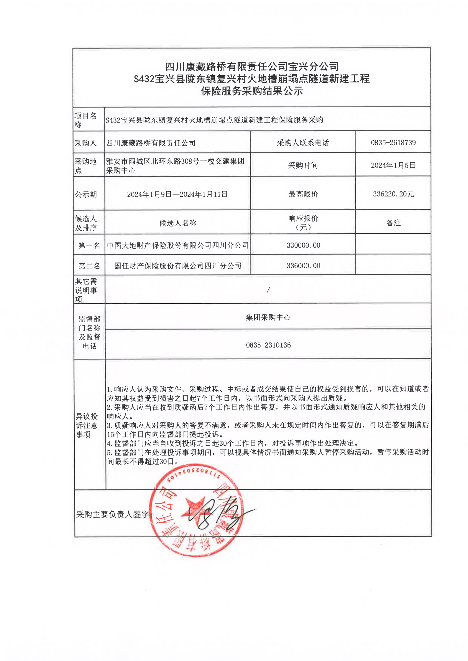 四川康藏路橋有限責(zé)任公司S432寶興縣隴東鎮(zhèn)復(fù)興村火地槽崩塌點(diǎn)隧道新建工程保險服務(wù)采購結(jié)果公示