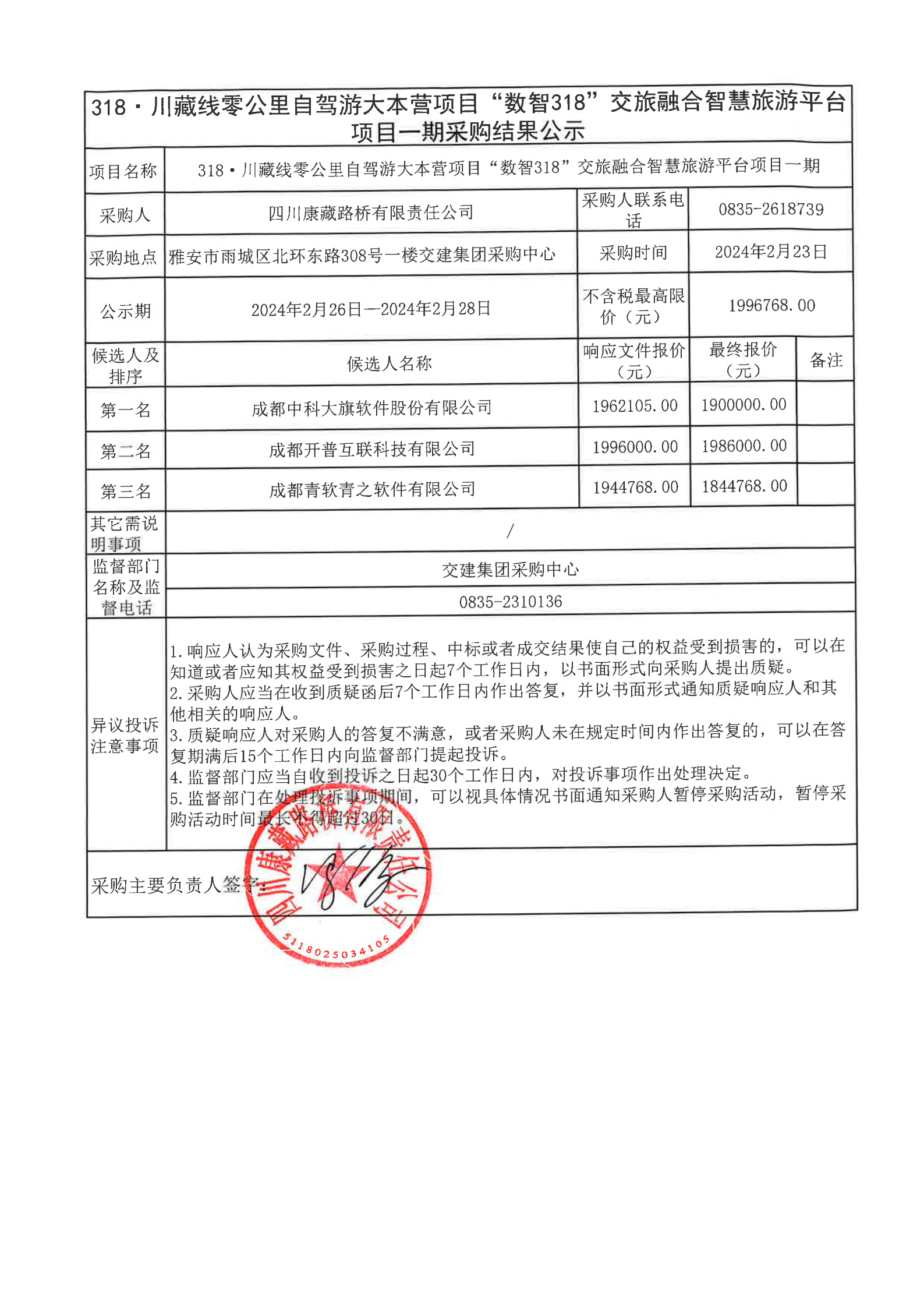 四川康藏路橋有限責任公司318·川藏公路零公里自駕游大本營項目“數(shù)智318”交旅融合智慧旅游平臺項目一期采購結(jié)果公示