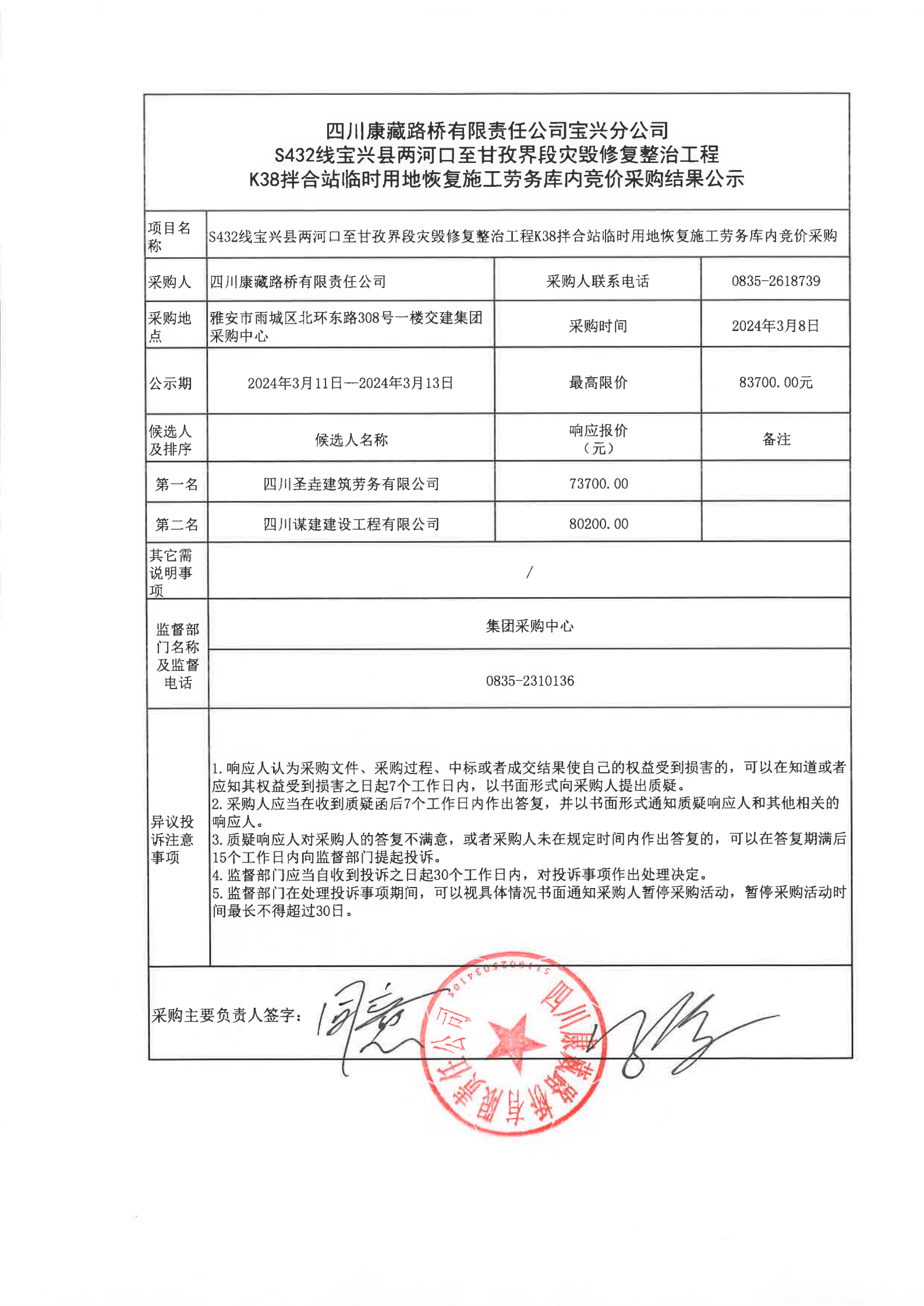 四川康藏路橋有限責(zé)任公司寶興分公司S432線寶興縣兩河口至甘孜界段災(zāi)毀修復(fù)整治工程K38拌合站臨時(shí)用地恢復(fù)施工勞務(wù)庫內(nèi)競價(jià)采購結(jié)果公示