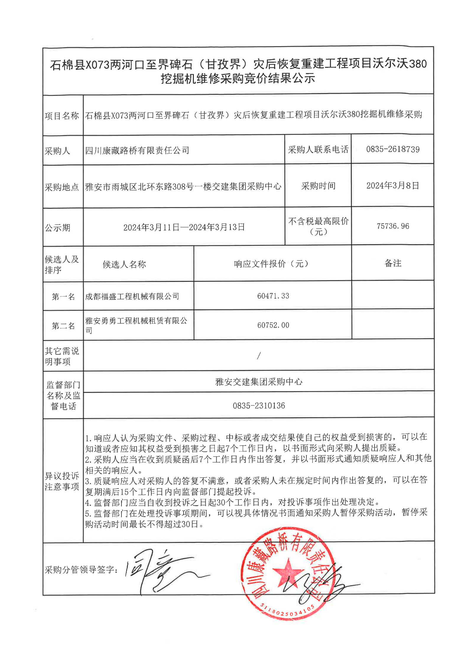 四川康藏路橋有限責任公司石棉縣X073兩河口至界碑石(甘孜界)災后恢復重建工程項目沃爾沃380挖掘機維修采購競價結果公示
