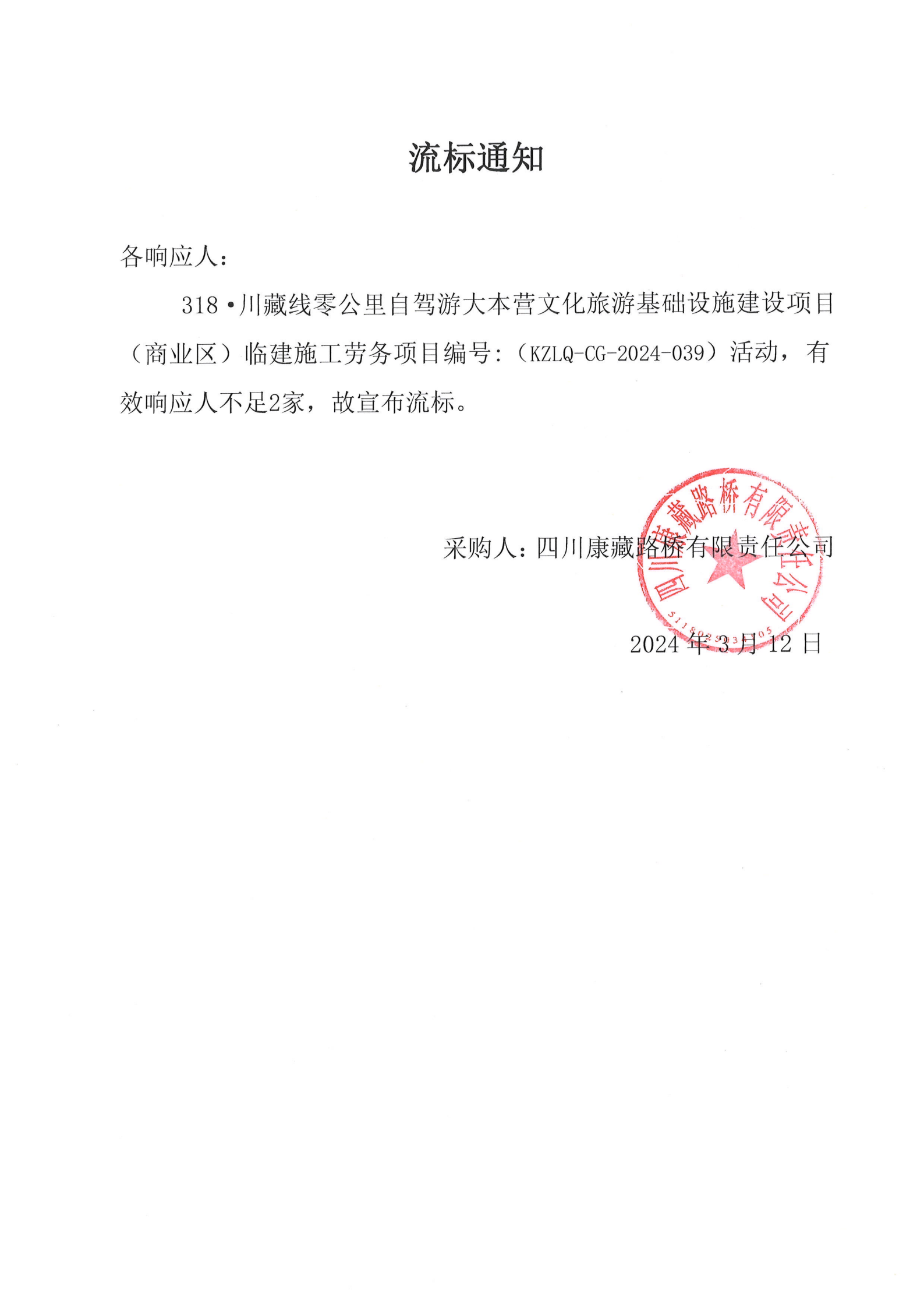 四川康藏路橋有限責(zé)任公司318·川藏線零公里自駕游大本營(yíng)文化旅游基礎(chǔ)設(shè)施建設(shè)項(xiàng)目(商業(yè)區(qū))臨建施工勞務(wù)流標(biāo)通知