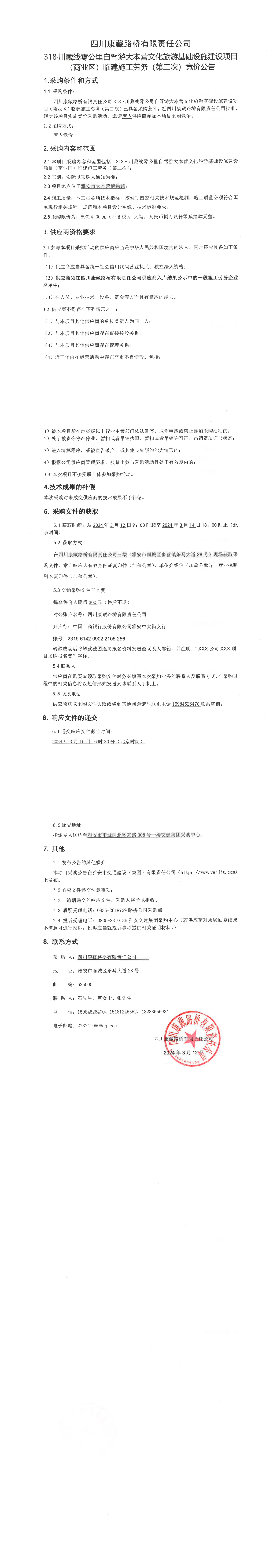 四川康藏路橋有限責任公司318·川藏公路零公里自駕游大本營文化旅游基礎設施建設項目(商業(yè)區(qū))臨建施工勞務(第二次)競價公告