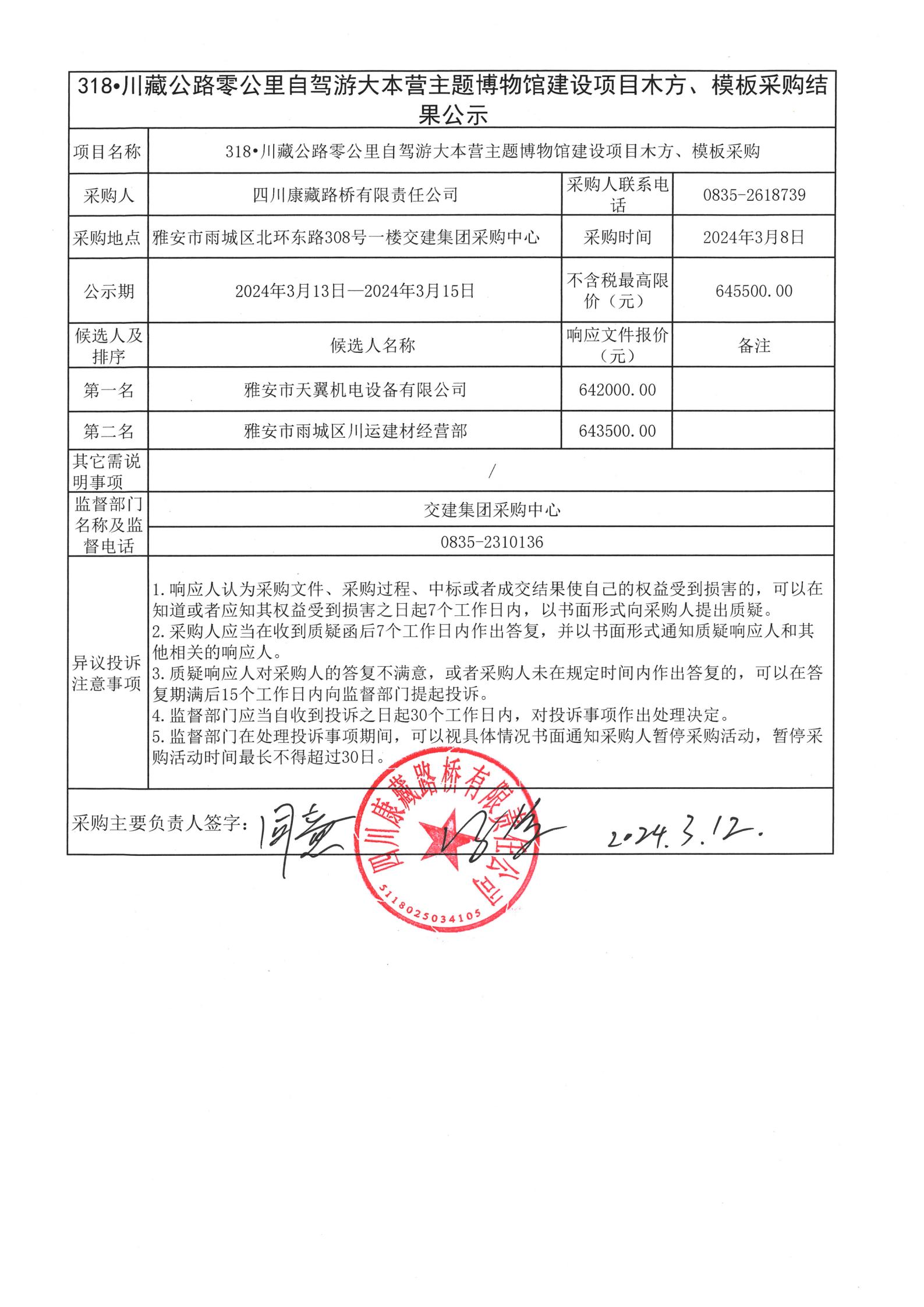 四川康藏路橋有限責(zé)任公司318•川藏公路零公里自駕游大本營(yíng)主題博物館建設(shè)項(xiàng)目木方、模板采購(gòu)結(jié)果公示