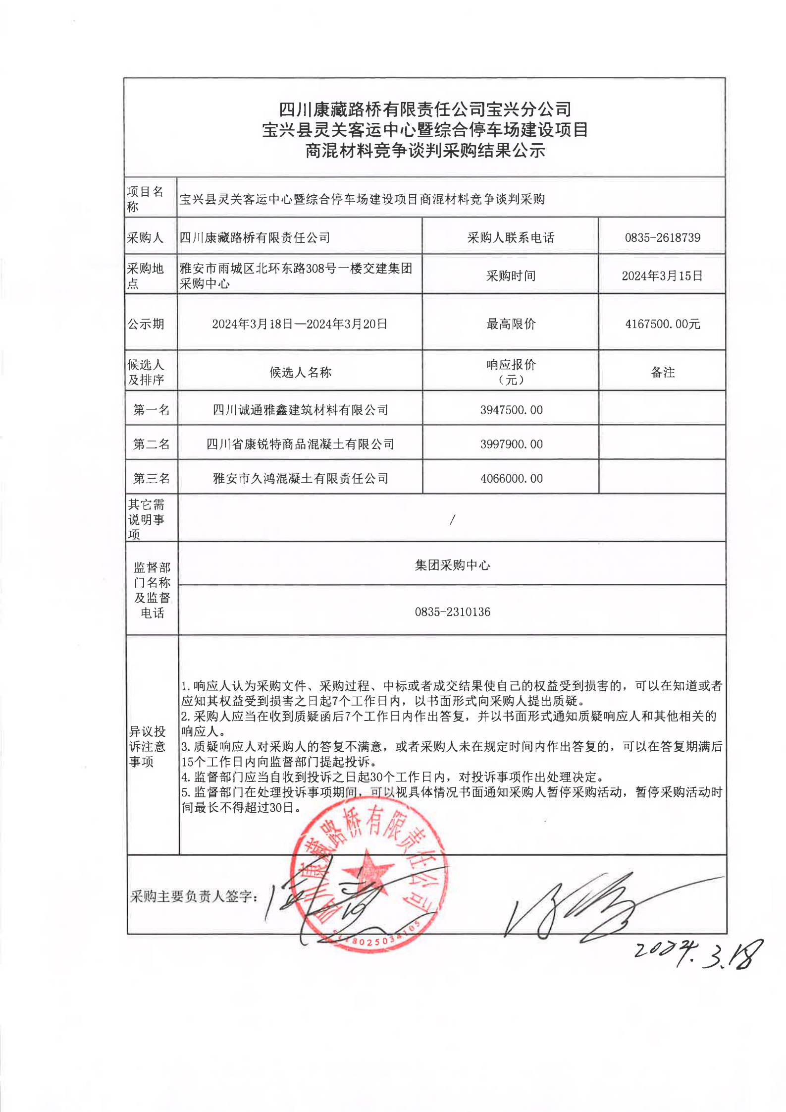 四川康藏路橋有限責(zé)任公司寶興分公司寶興縣靈關(guān)客運中心暨綜合停車場建設(shè)項目商混材料競爭談判采購結(jié)果公示