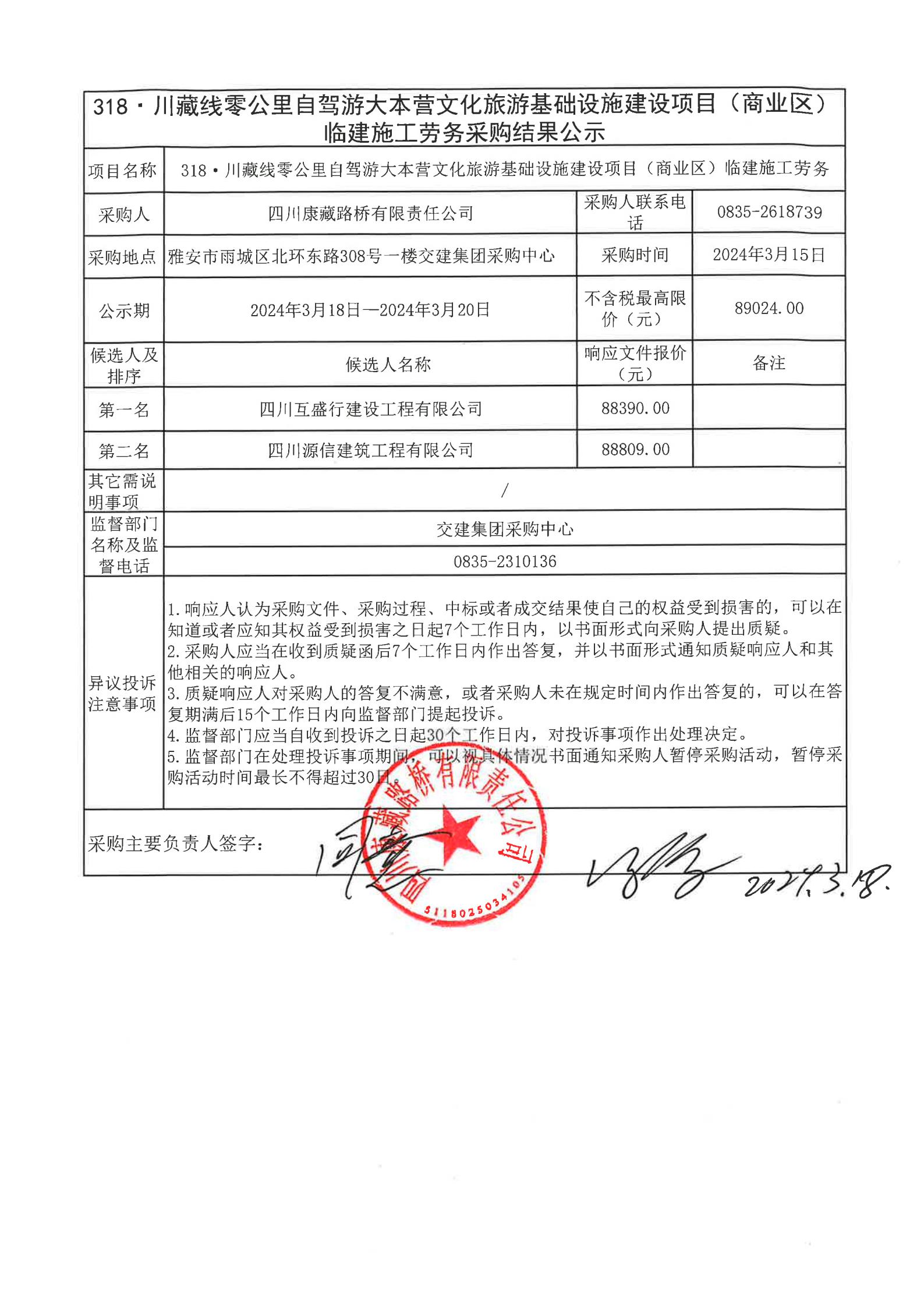四川康藏路橋有限責任公司318·川藏線零公里自駕游大本營文化旅游基礎設施建設項目(商業(yè)區(qū))臨建施工勞務結(jié)果公示
