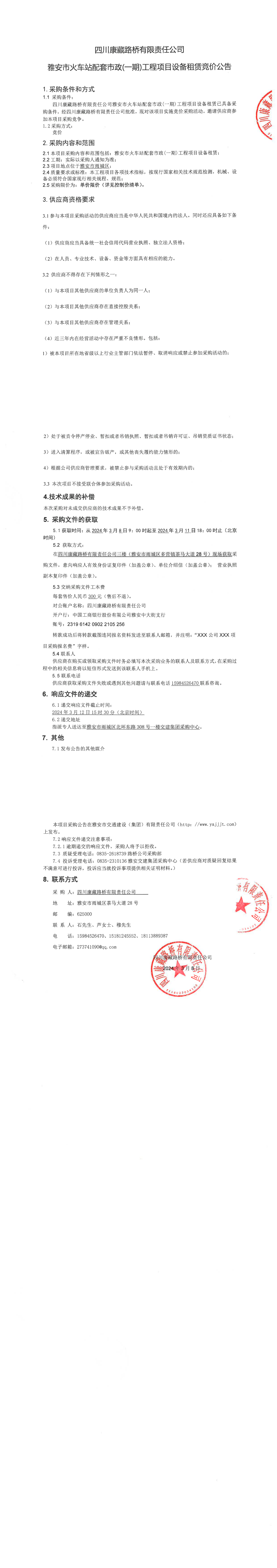 四川康藏路橋有限責任公司雅安市火車站配套市政(一期)工程項目設備租賃競價公告