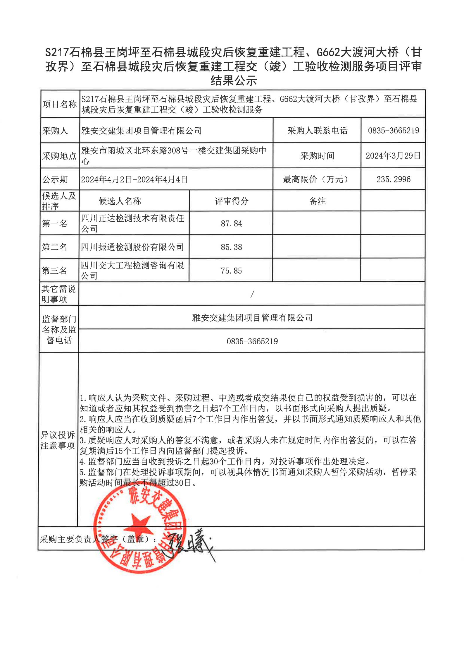 雅安交建集團(tuán)項目管理有限公司S217石棉縣王崗坪至石棉縣城段災(zāi)后恢復(fù)重建工程、G662大渡河大橋(甘孜界)至石棉縣城段災(zāi)后恢復(fù)重建工程交(竣)工驗收檢測服務(wù)項目評審結(jié)果公示