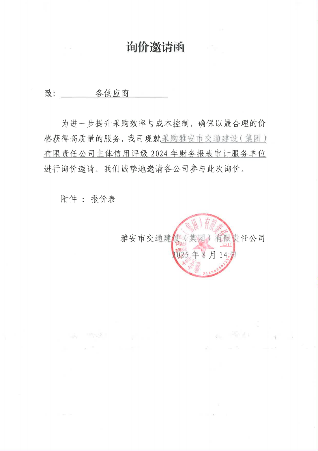 關(guān)于采購(gòu)雅安市交通建設(shè)(集團(tuán))有限責(zé)任公司主體信用評(píng)級(jí)2024年財(cái)務(wù)報(bào)表審計(jì)服務(wù)單位的詢價(jià)函