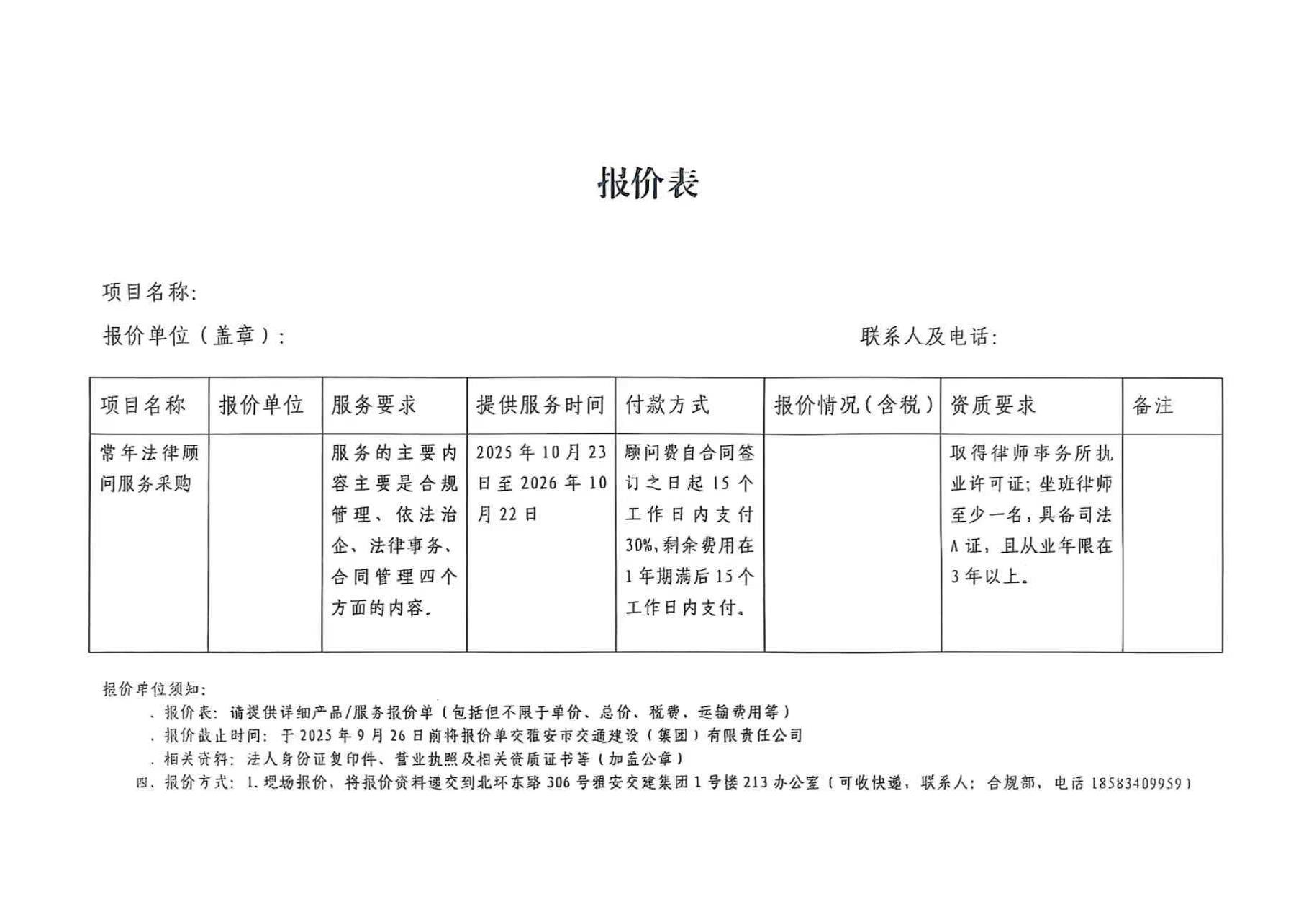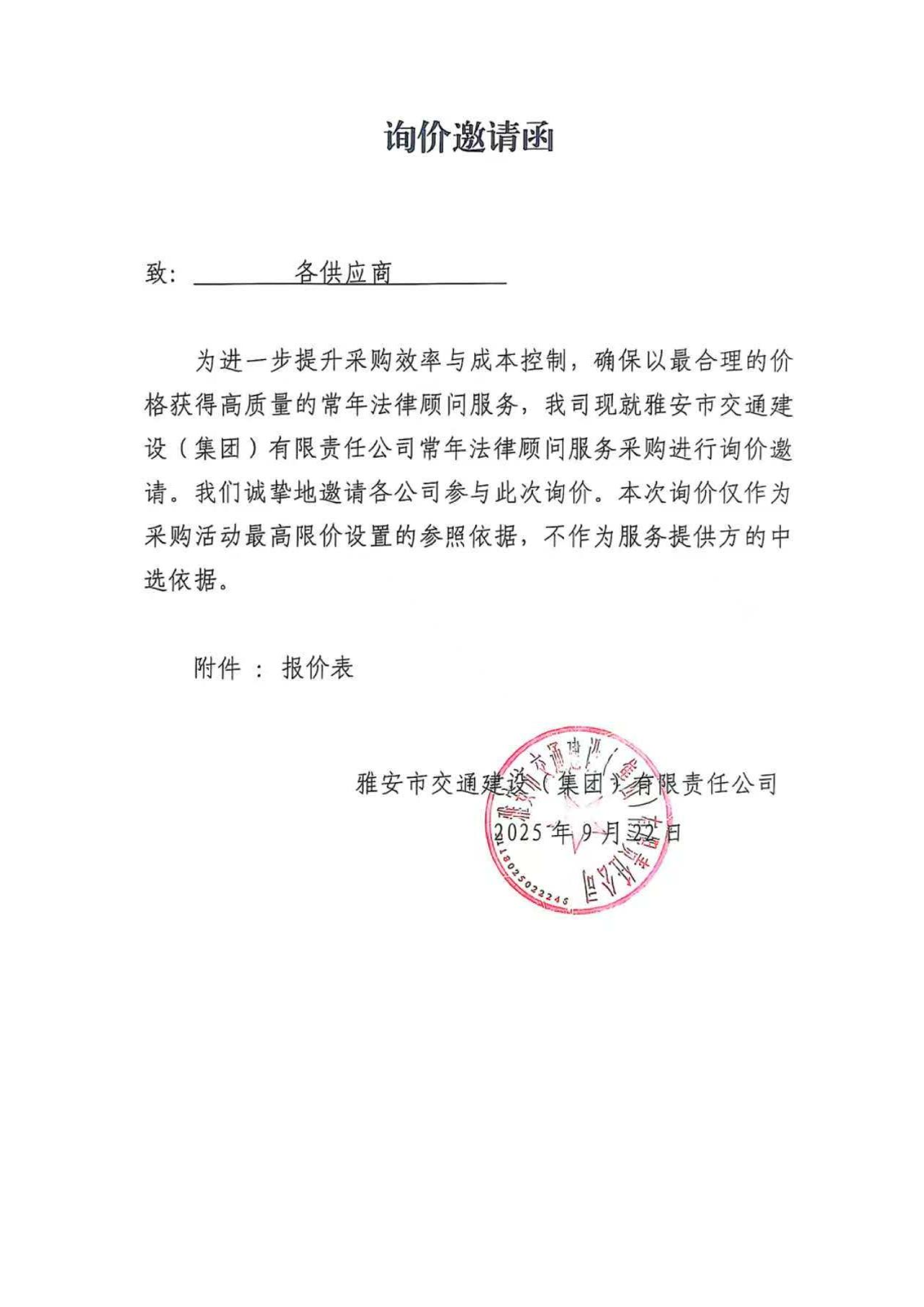 關(guān)于雅安市交通建設(shè)(集團(tuán))有限責(zé)任公司常年法律顧問服務(wù)的詢價(jià)函