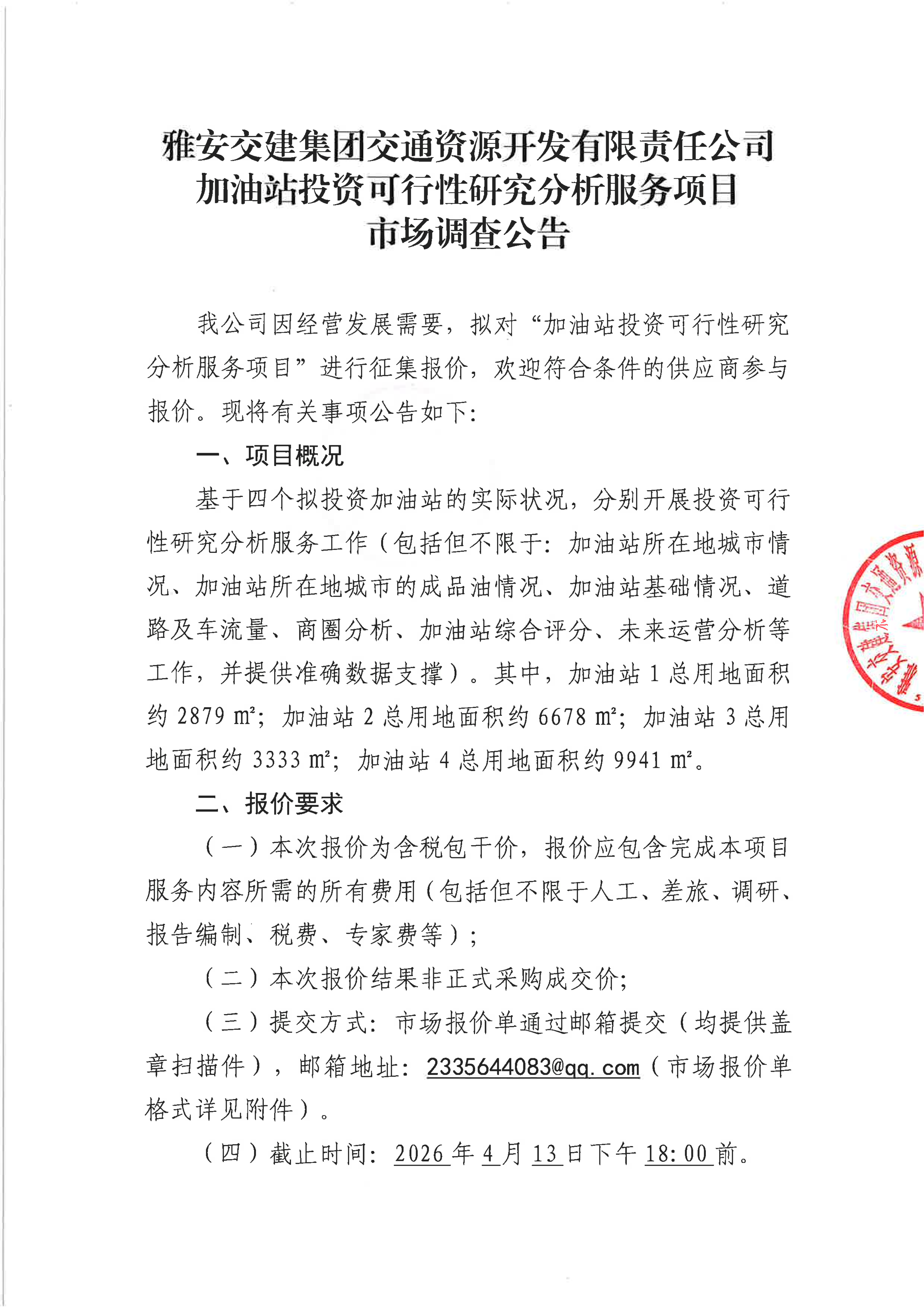 雅安交建集團(tuán)交通資源開(kāi)發(fā)有限責(zé)任公司加油站投資可行性研究分析服務(wù)項(xiàng)目市場(chǎng)調(diào)查公告