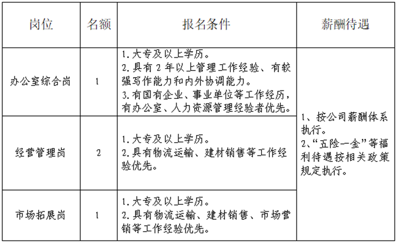 雅安交建集團(tuán)運(yùn)通貿(mào)易有限公司是雅安市交通建設(shè)(集團(tuán))有限責(zé)任公司下屬子公司。主要從事普通貨運(yùn)、建材銷售、供應(yīng)鏈管理、貨運(yùn)代理、貨運(yùn)信息咨詢服務(wù)、倉(cāng)儲(chǔ)配送服務(wù)等工作,F(xiàn)根據(jù)公司業(yè)務(wù)發(fā)展需要,決定招聘4名工作人員,現(xiàn)將有關(guān)事項(xiàng)公告如下:
