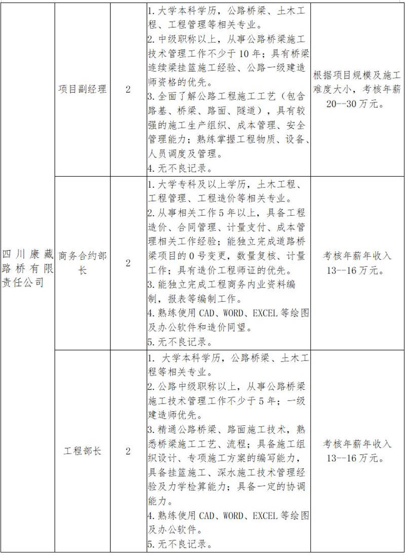 根據(jù)發(fā)展需要,決定面向社會公開招聘雅安市交通建設(shè)(集團)有限責任公司(以下簡稱“雅安交建集團”)所屬子公司工程項目主要負責人10名,現(xiàn)將有關(guān)事項公告如下: