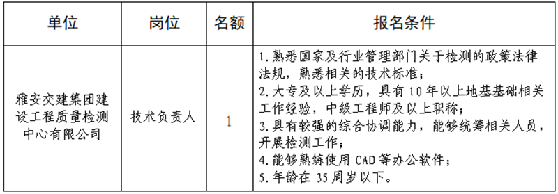 雅安交建集團(tuán)關(guān)于公開(kāi)招聘所屬子公司工作人員的公告(工程檢測(cè)中心)