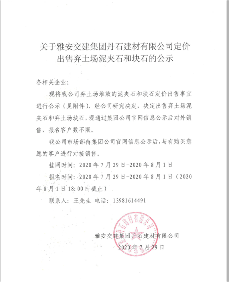 關于雅安交建集團丹石建材有限公司定價出售棄土場泥夾石和塊石的公示