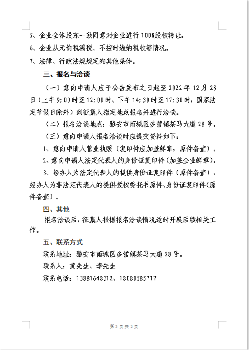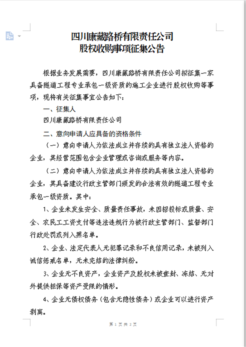 四川康藏路橋有限責(zé)任公司 股權(quán)收購(gòu)事項(xiàng)征集公告