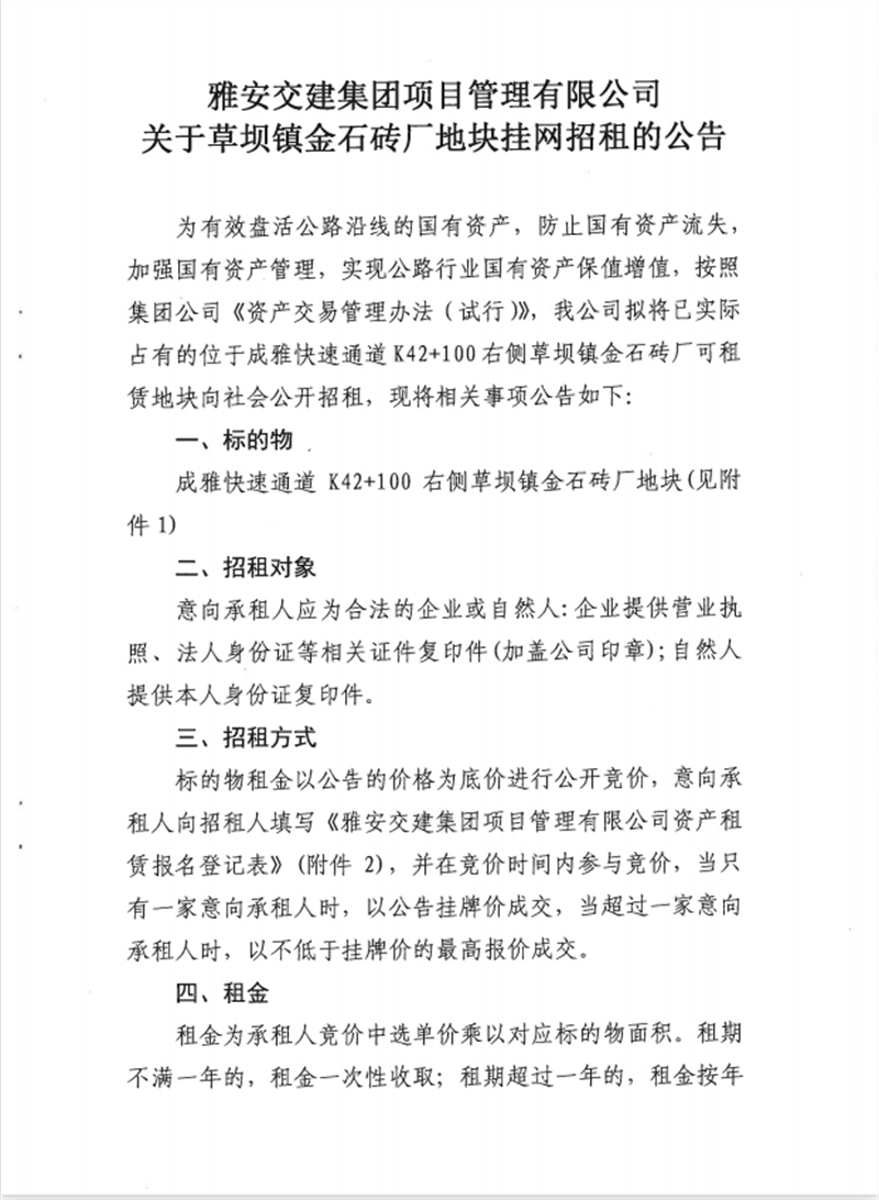 關于金石磚廠地塊公開招租的公告
