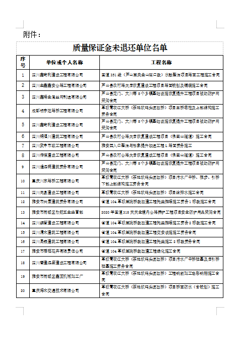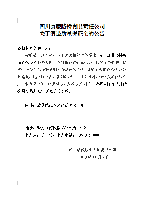 四川康藏路橋有限責任公司關(guān)于清退質(zhì)量保證金的公告