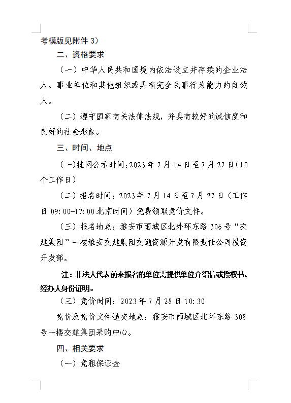 雅安交建集團(tuán)交通資源開(kāi)發(fā)有限責(zé)任公司雨名快速通道名山服務(wù)區(qū)場(chǎng)地(游樂(lè)類(lèi)項(xiàng)目)招租公告