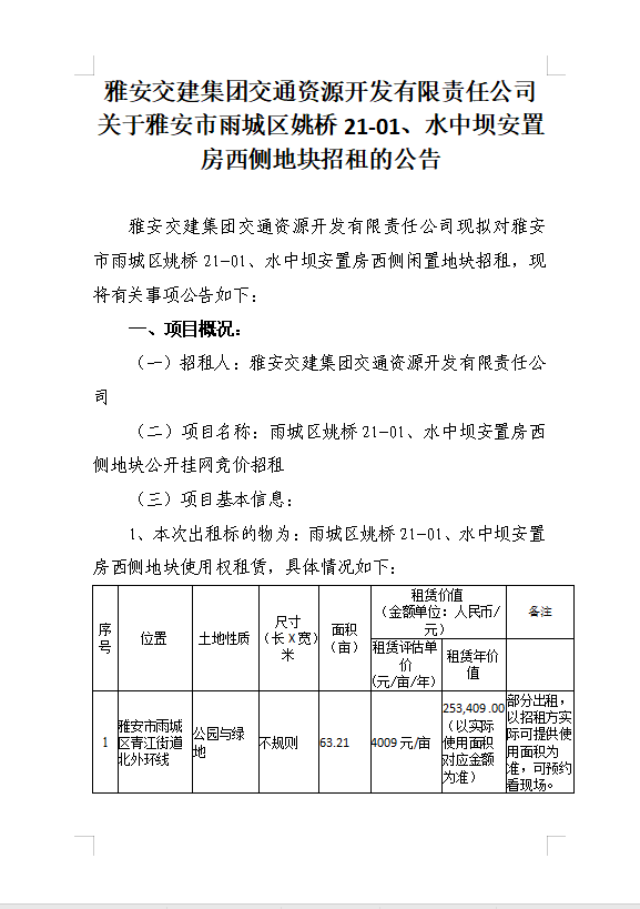 雅安交建集團(tuán)交通資源開(kāi)發(fā)有限責(zé)任公司關(guān)于雅安市雨城區(qū)姚橋21-01、水中壩安置房西側(cè)地塊招租的公告