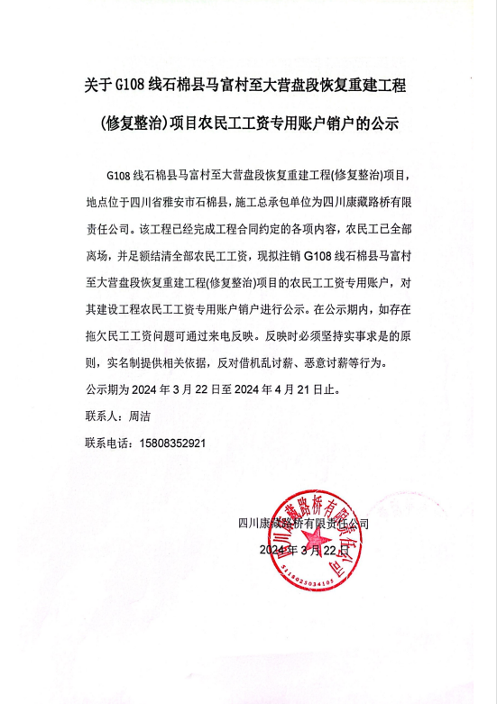 關(guān)于G108線石棉縣馬富村至大營(yíng)盤(pán)段恢復(fù)重建工程(修復(fù)整治)項(xiàng)目農(nóng)民工工資專用賬戶銷戶的公示