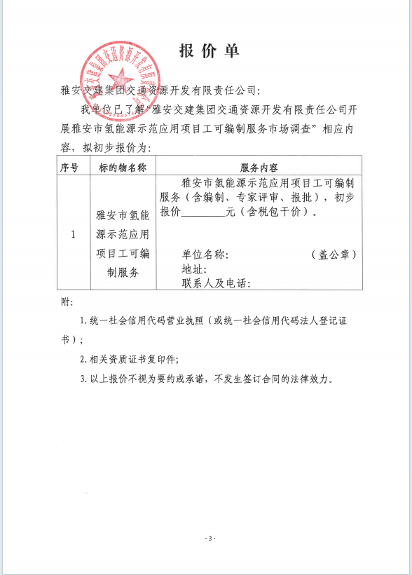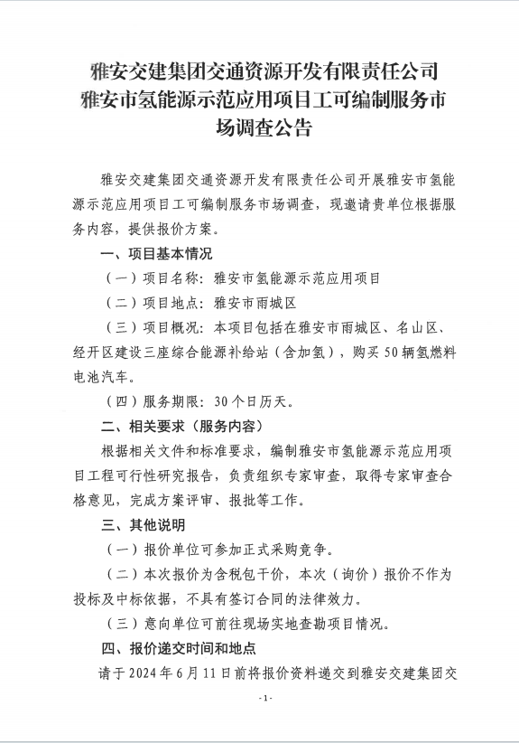 雅安交建集團交通資源開發(fā)有限責(zé)任公司雅安市氫能源示范應(yīng)用項目工可編制服務(wù)市場調(diào)查公告