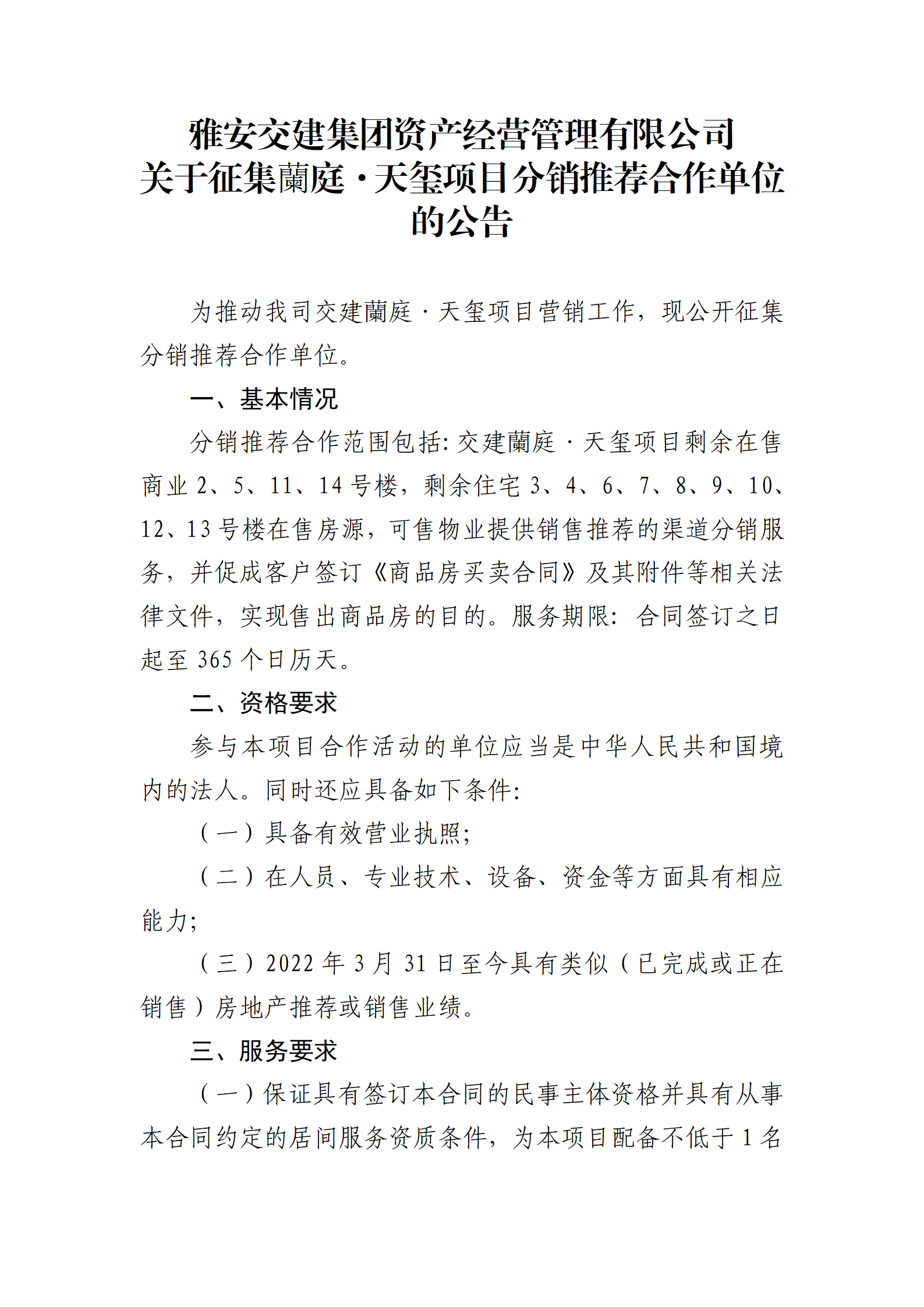雅安交建集團(tuán)資產(chǎn)經(jīng)營管理有限公司 關(guān)于征集蘭庭·天璽項(xiàng)目分銷推薦合作單位的公告