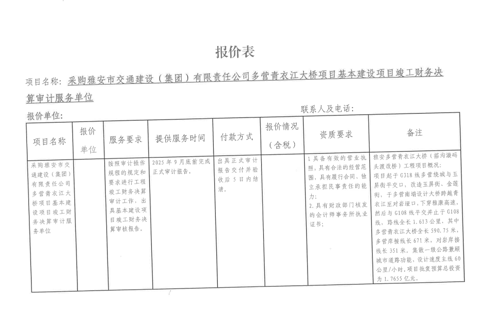 詢價邀請函——采購雅安市交通建設(shè)(集團)有限責任公司多營青衣江大橋項目基本建設(shè)項目竣工財務(wù)決算審計服務(wù)單位