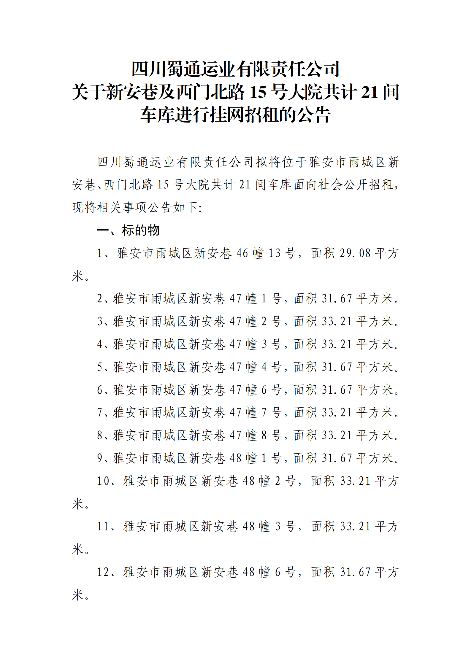 四川蜀通運業(yè)有限責(zé)任公司 關(guān)于新安巷及西門北路15號大院共計21間車庫進行掛網(wǎng)招租的公告