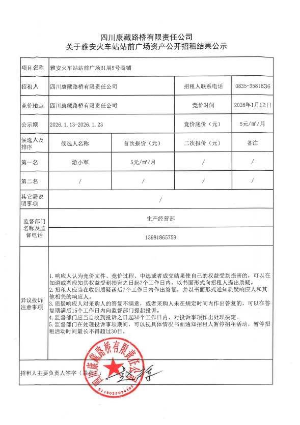 四川康藏路橋有限責(zé)任公司關(guān)于雅安火車站站前廣場資產(chǎn)公開招租結(jié)果公示